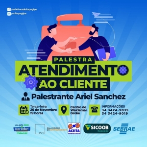 No dia 29 de novembro, às 19 horas, acontece a palestra "Atendimento Ao Cliente" ministrada pelo consultor e palestrante Ariel Sanchez do SEBRAE, no Centro de Eventos Waldemar Groke.