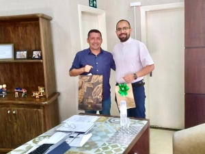 O padre trouxe uma lembrancinha para o prefeito Ricardo que o retribuiu com outra.