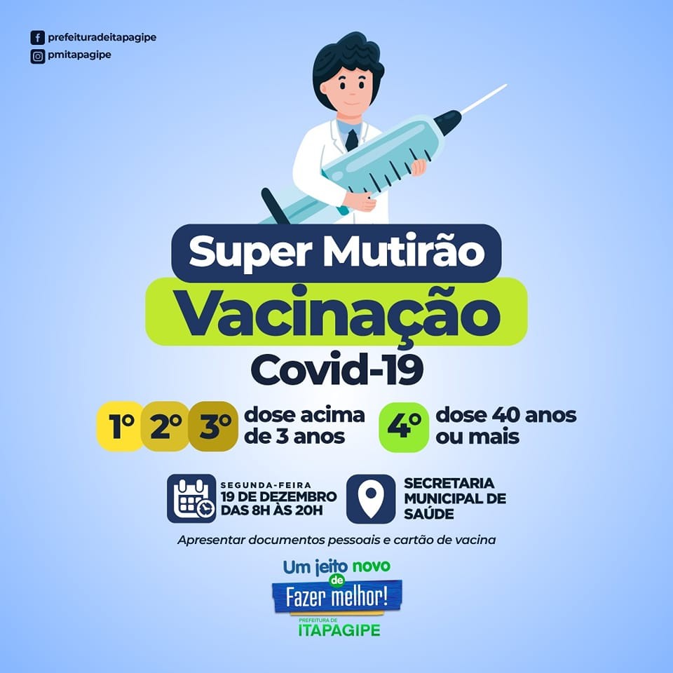 Segunda-feira, dia 19 de dezembro, é dia de vacinação contra a Covid-19 em Itapagipe!