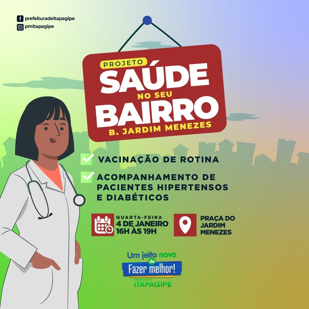 Nesta quarta-feira, dia 04 de janeiro, nossa equipe da saúde estará na praça do Jardim Menezes para realizar mais uma etapa do projeto Saúde No Seu Bairro!