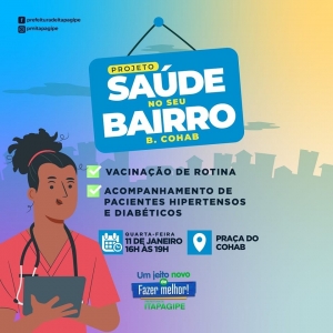 Nesta quarta-feira, dia 11 de janeiro, nossa equipe da saúde estará na praça da COAHB para realizar mais uma etapa do projeto Saúde No Seu Bairro!