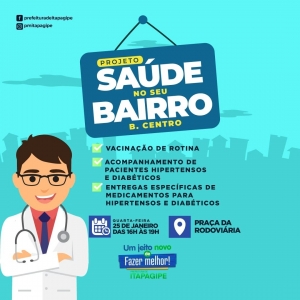 Nesta quarta-feira, dia 25 de janeiro, nossa equipe da saúde estará na praça da rodoviária para realizar mais uma etapa do projeto Saúde No Seu Bairro!