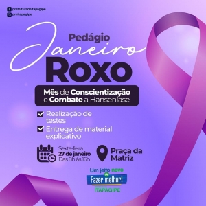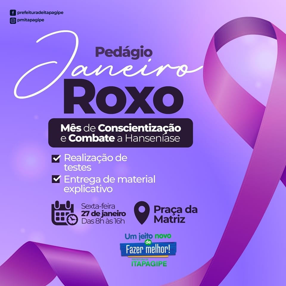 Nesta sexta-feira, dia 27 de janeiro, das 8:00 às 16:00, nossa equipe da saúde estará na praça da matriz realizando o pedágio do janeiro roxo, que é o mês da conscientização e combate a hanseníase.