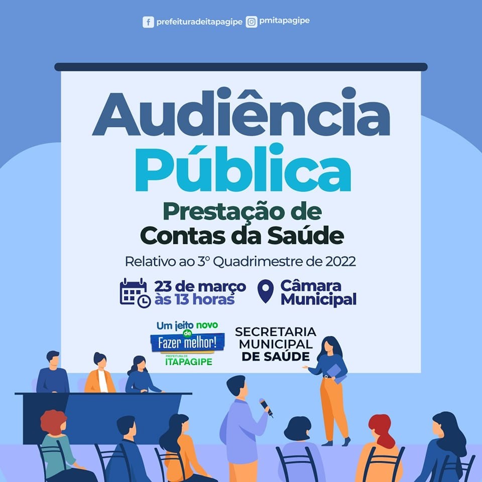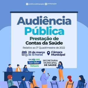 Convidamos você a estar presente na audiência pública de prestação de contas da saúde, que acontece nesta quinta-feira, dia 23 de março, às 13:00, na Câmara Municipal.