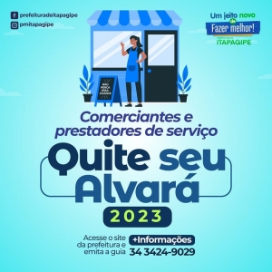 Atenção comerciantes e prestadores de serviço, acesse nosso site, emita a sua guia e quite seu alvará 2023!