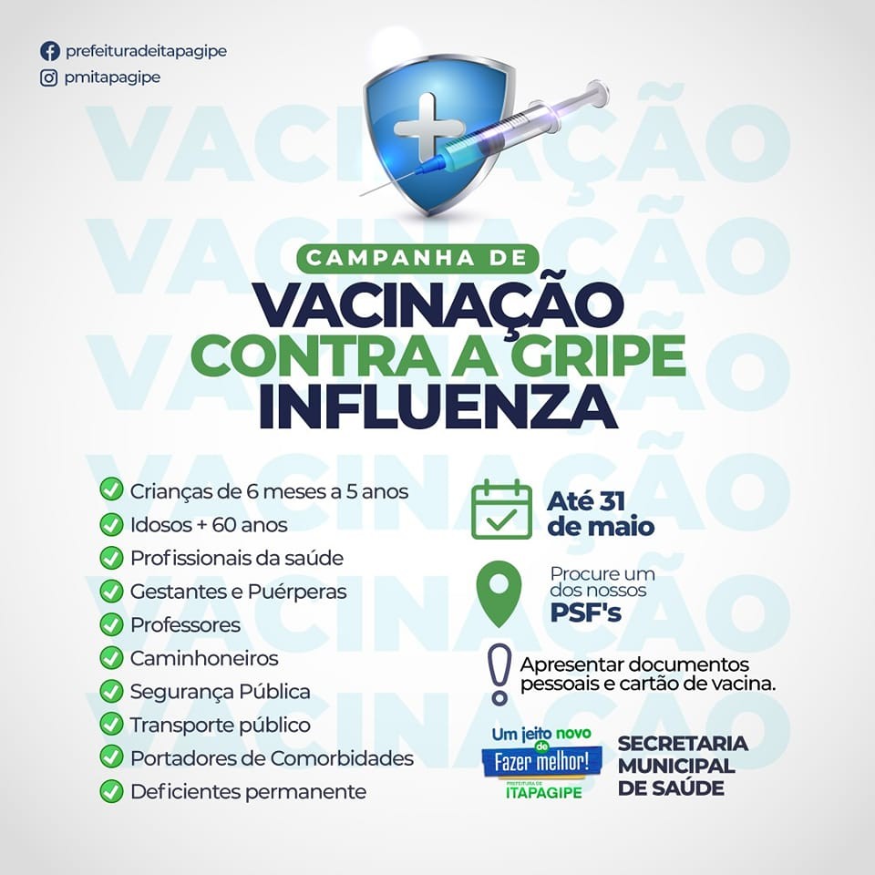 A Campanha de Vacinação Contra a Gripe Influenza foi estendida até dia 31 de maio. Você que atende os critérios de prioridade não pode ficar de fora dessa! Procure um dos nossos PSF's e se vacine!