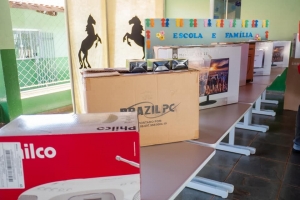 Durante a tarde desta segunda-feira, o prefeito Ricardo Garcia e a secretária Lenira Carneiro fizeram a entrega de equipamentos às Escolas e Creches Municipais, que trarão ainda mais conforto e segurança ao ambiente escolar; entre eles televisores, aparelhos de som, bebedouros, computadores, mesa para educação infantil, lixeiras de coleta seletiva, impressoras, forno industrial, laboratório de ciências e mesas acessíveis a cadeirantes.