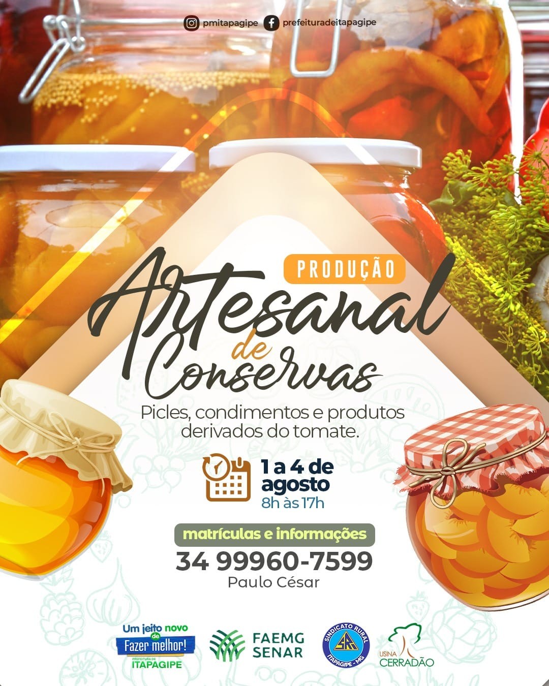 Então se prepare pois em parceria com o @senaritapagipe estamos disponibilizando de forma gratuita, o curso de Produção Artesanal de Conservas focado na técnica de picles, condimentos e derivados de tomate.