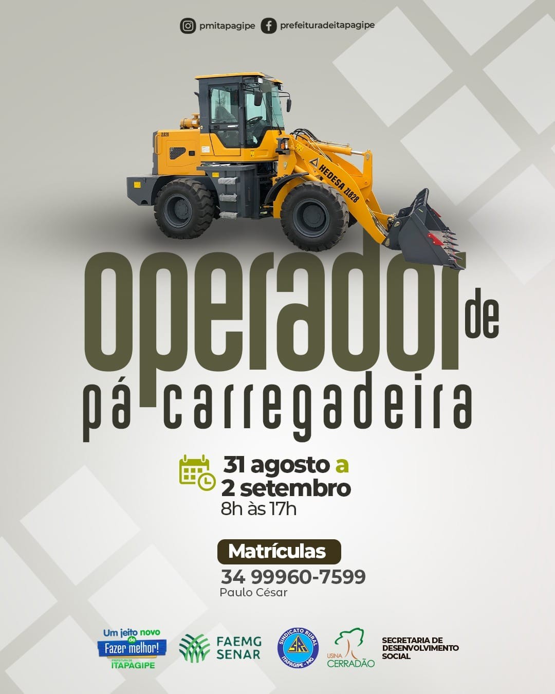 A prefeitura de Itapagipe em parceria com o SENAR está montando mais uma turma para o curso de Operador de Pá Carregadeira.