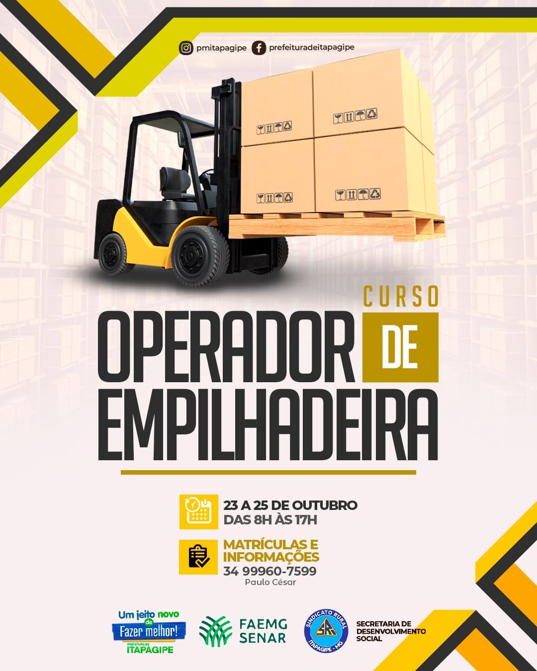 A Prefeitura de Itapagipe em parceria com o SENAR trás para nossa cidade, o curso de operador de empilhadeira.