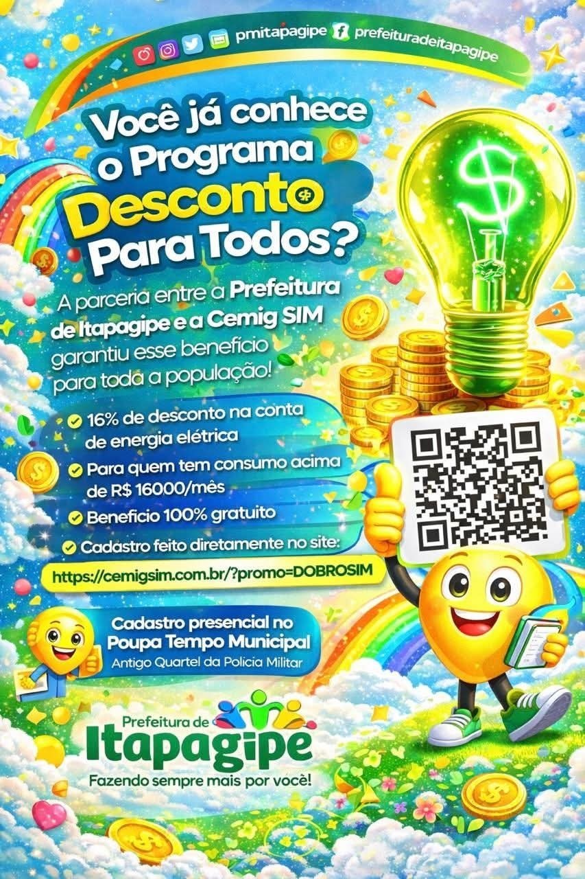 O Governo Municipal de Itapagipe lançou o Programa Desconto Para Todos, uma parceria com a Cemig SIM (empresa do Grupo Cemig que atua no mercado de energia solar por assinatura) que garante até 16% de desconto na conta de energia para residências, condomínios, comércios e propriedades rurais com faturas de energia a partir de R$ 160 mensais, ajudando a reduzir despesas e fortalecendo o orçamento familiar.