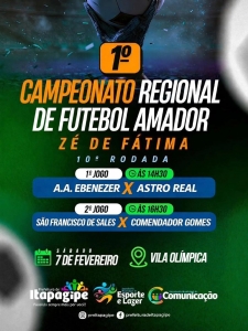 A 10ª rodada do Campeonato Regional de Futebol Amador Zé de Fátima promete grandes emoções neste sábado, 7 de fevereiro, na Vila Olímpica, em Itapagipe.