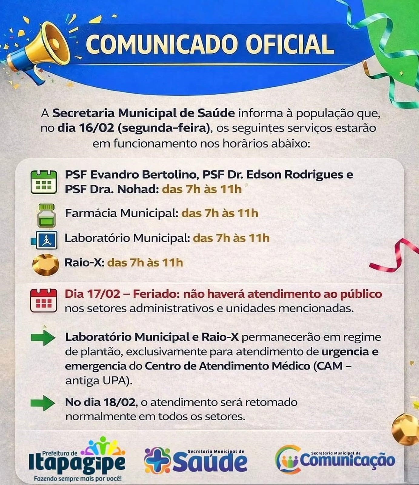 A Secretaria Municipal de Saúde informa à população que, no dia 16/02 (segunda-feira), os seguintes serviços estarão em funcionamento nos horários abaixo:
