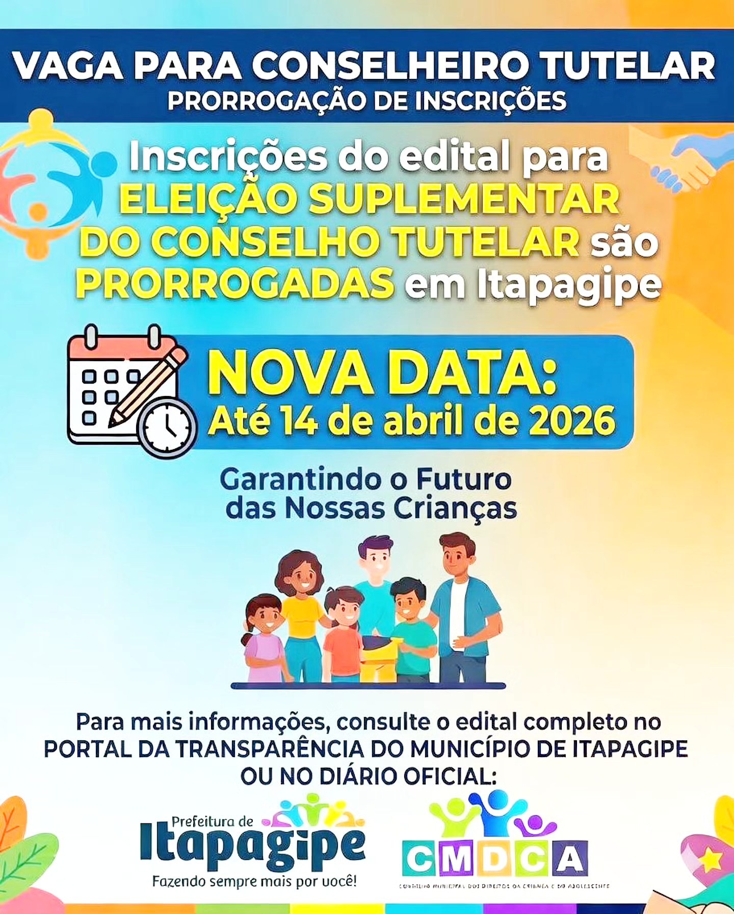 O Conselho Municipal dos Direitos da Criança e do Adolescente (CMDCA) de Itapagipe informa que foi prorrogado o prazo de inscrições do edital para a eleição suplementar de Conselheiro Tutelar no município.